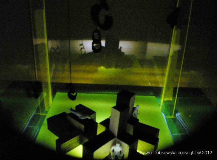 Constellation project made with Alyssa Ueno, Heterotopia Provocations exhibition, June 2010. Every wooden box had a small set designed to be look at through a small hole in the box. Participants were entering a dark side where the only thing one could see were the small sources of light from the boxes. Each box had a light source inside. With the smell of fresh grass which was bending softly under feet, an observer could look into nine different planets inside the boxes. Depending on the order of viewing, an observer was making an individual kind of constellation with the chosen path.
